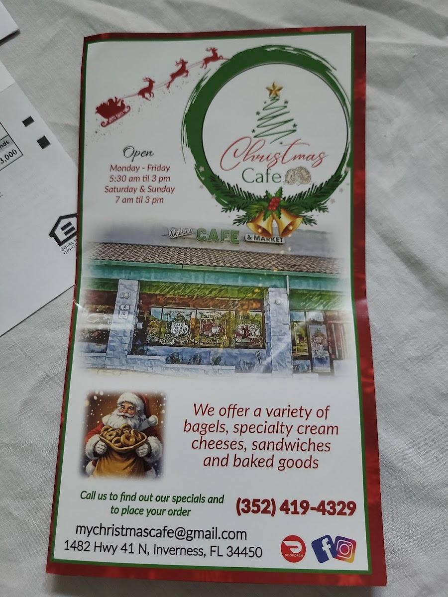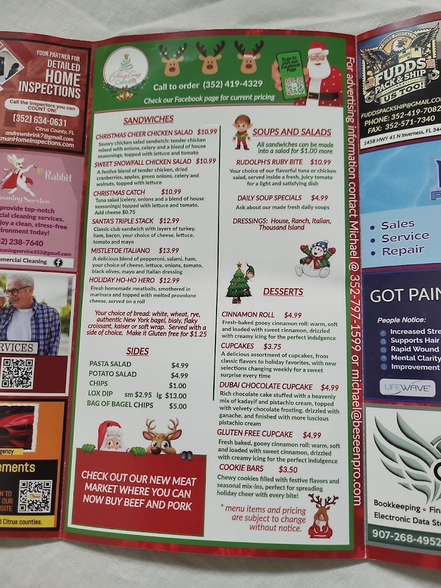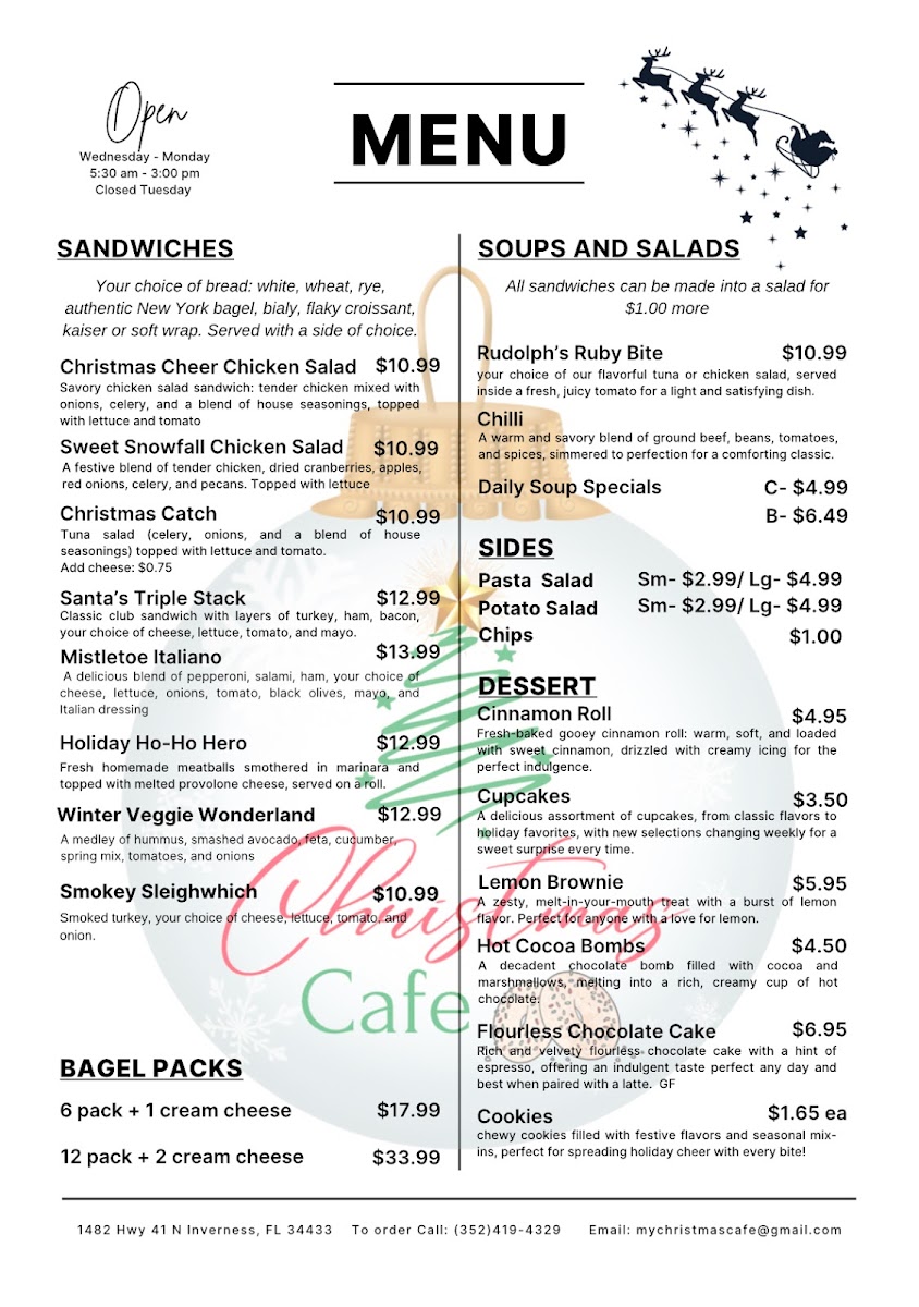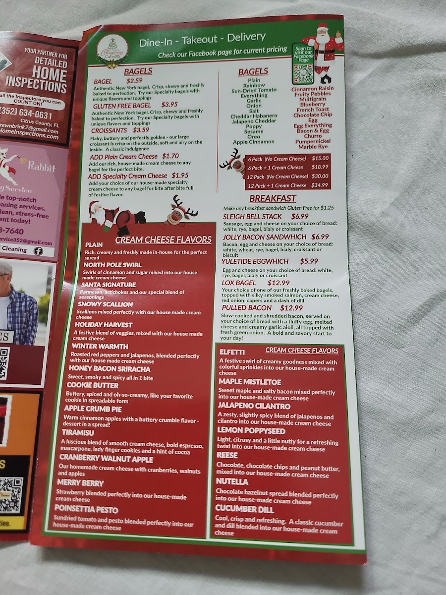 The menu offers a variety of options suitable for breakfast, light meals, and casual dining. It is organized into several key categories, including soups and salads, bagel packs, and breakfast items.